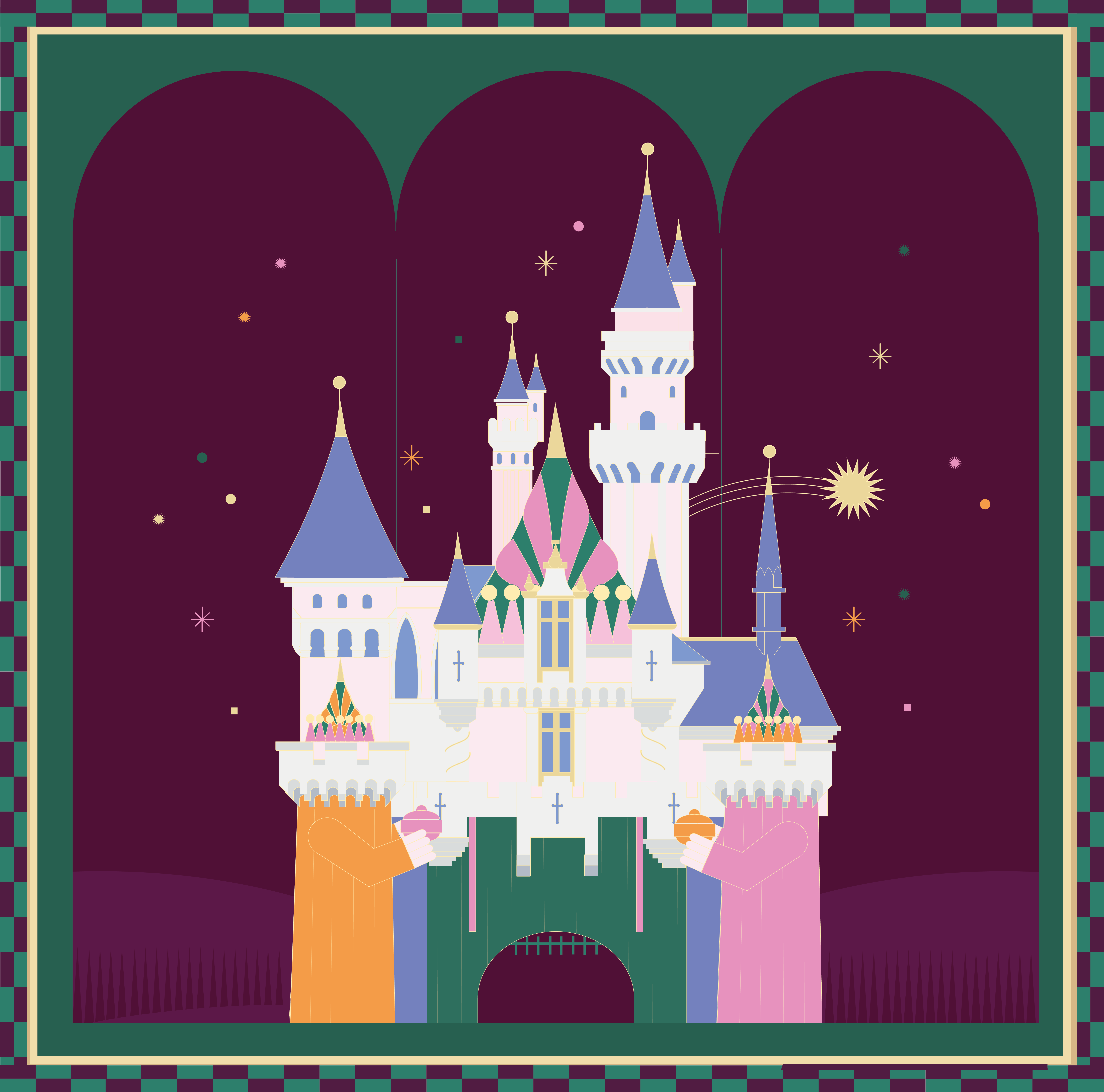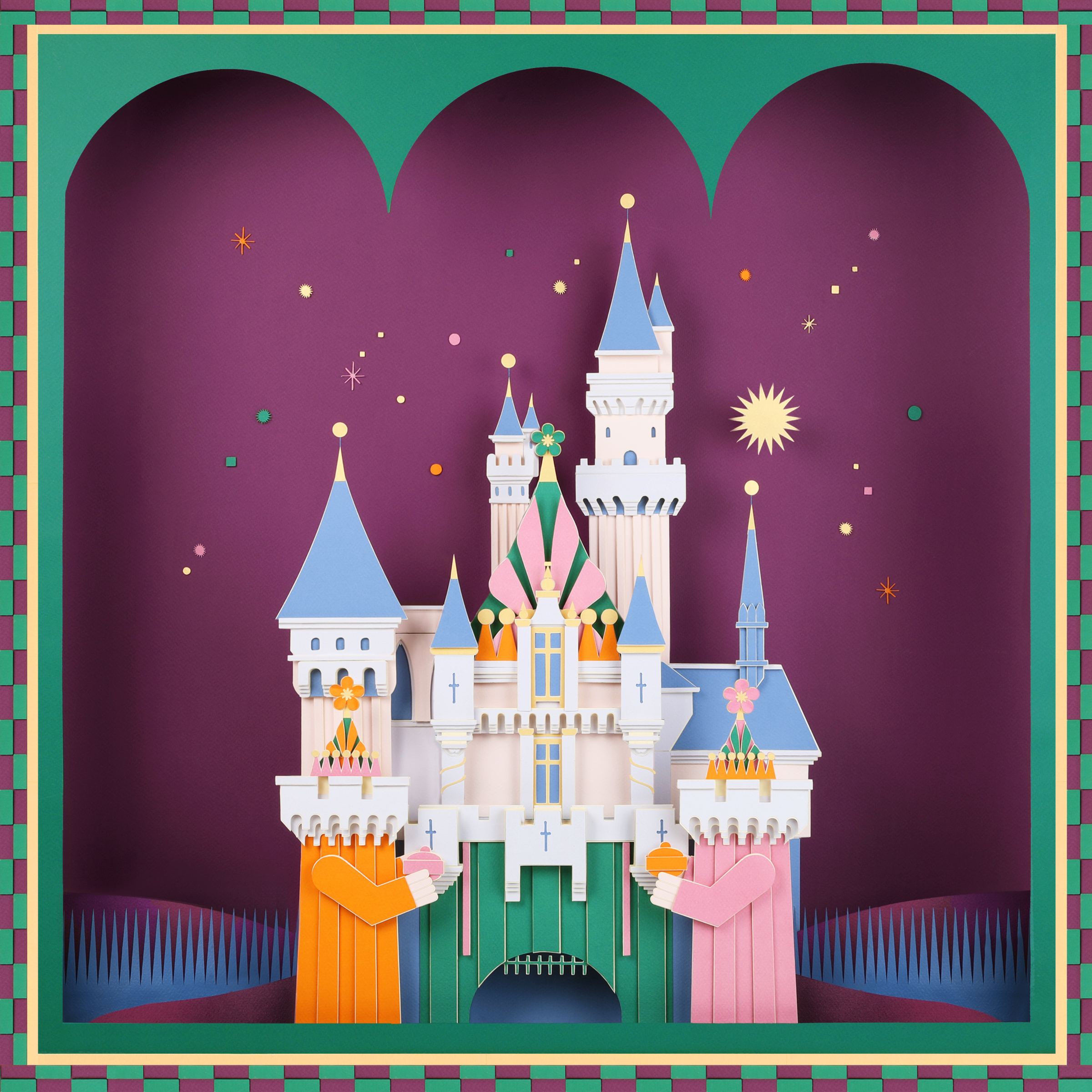 3 kings day is a special celebration in many countries around the world. For this special occasion, Disney commissioned me to dress up the Disneyland California castle for the festivities. I created a castle where the 3 kings were the 3 pillars, each one on a tower, inviting us into this magical world.