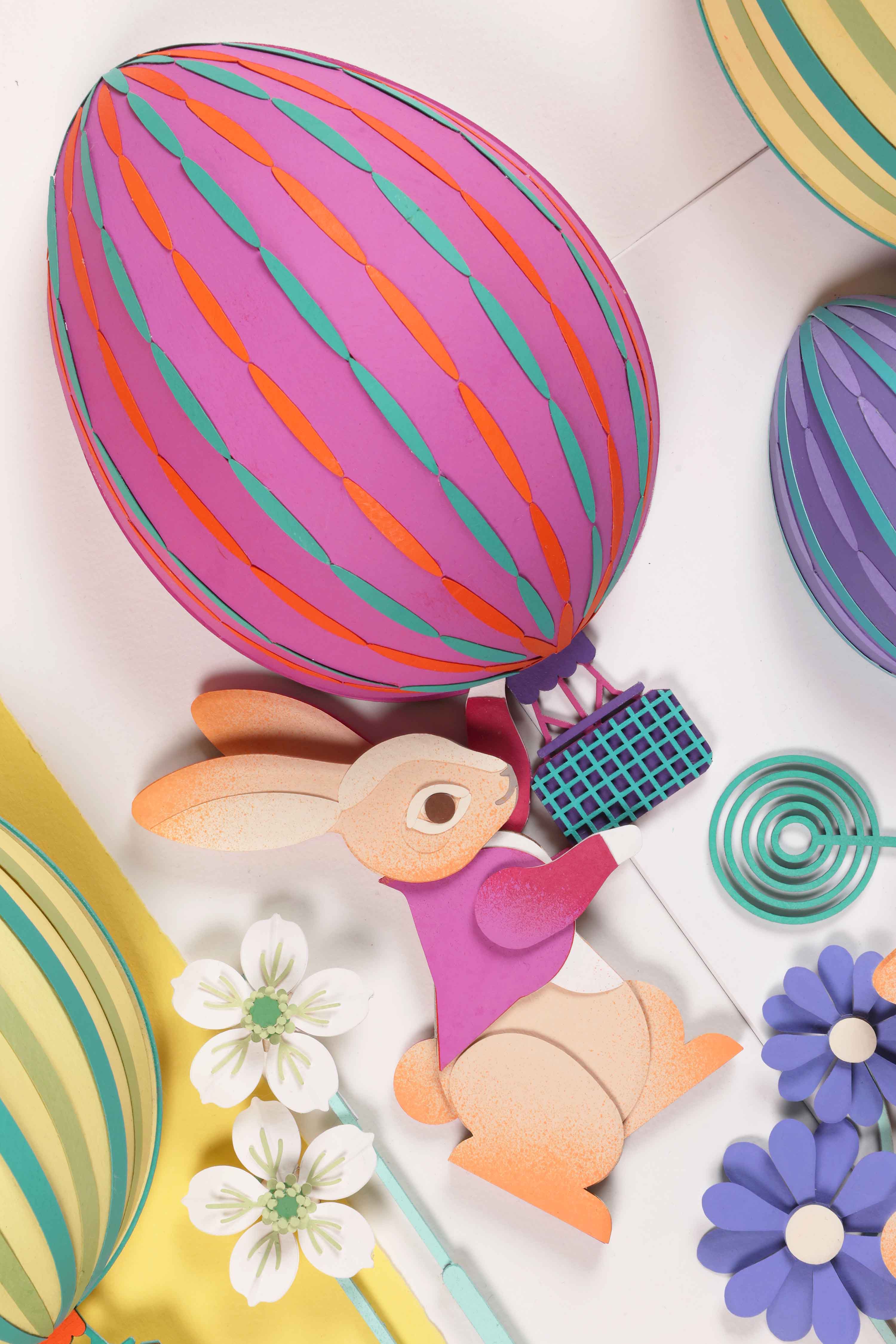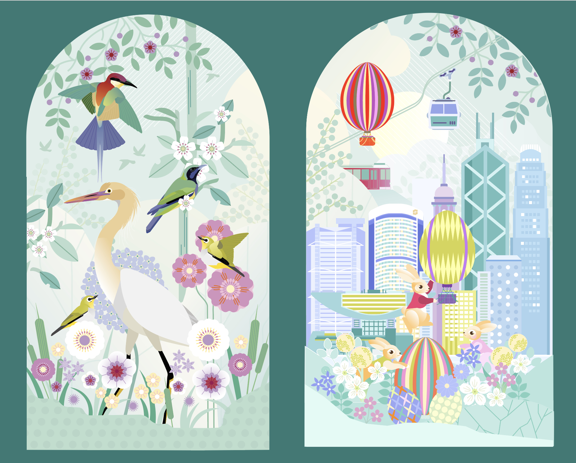 This set its called Easter, and it will be installed during the Easter holidays. It features 3 bunny rabbits; one dressed like the concierge at the hotel, easter eggs balloons like if they are landing in the city, a sort of magical window inviting the children to discover the city of Hong Kong. I developed the vector files and below you can see the progress and the final set that will be installed in the cabinet.