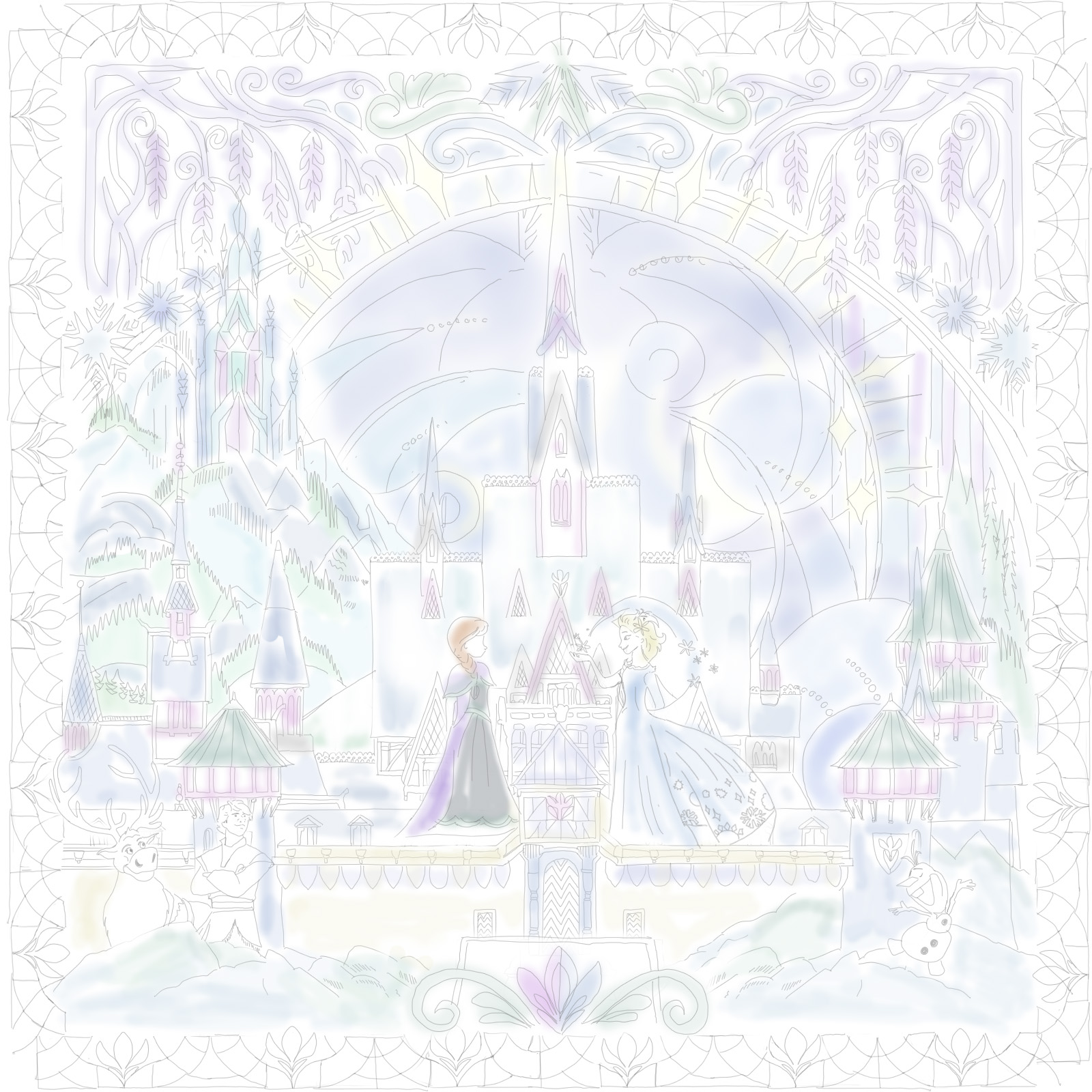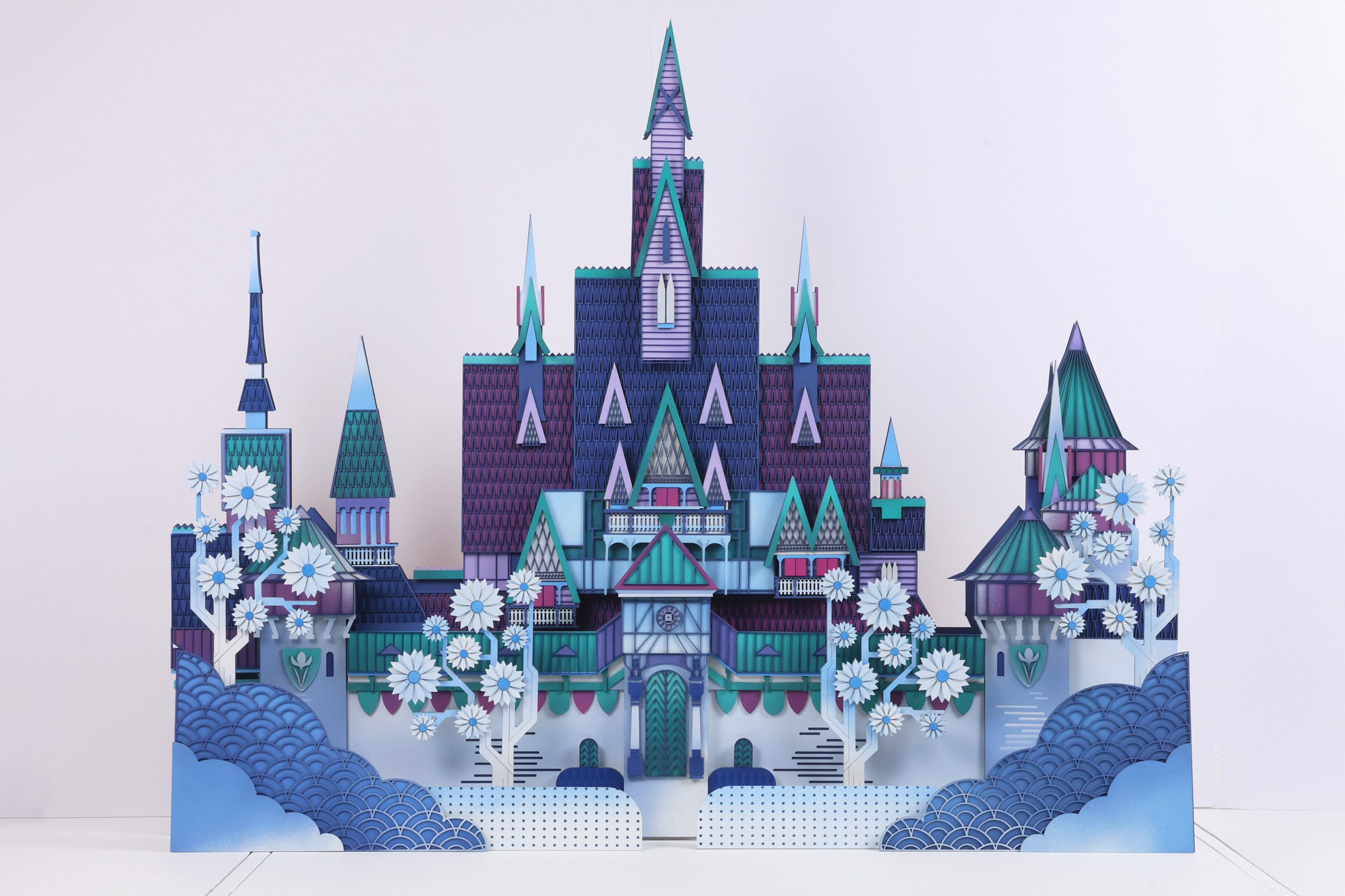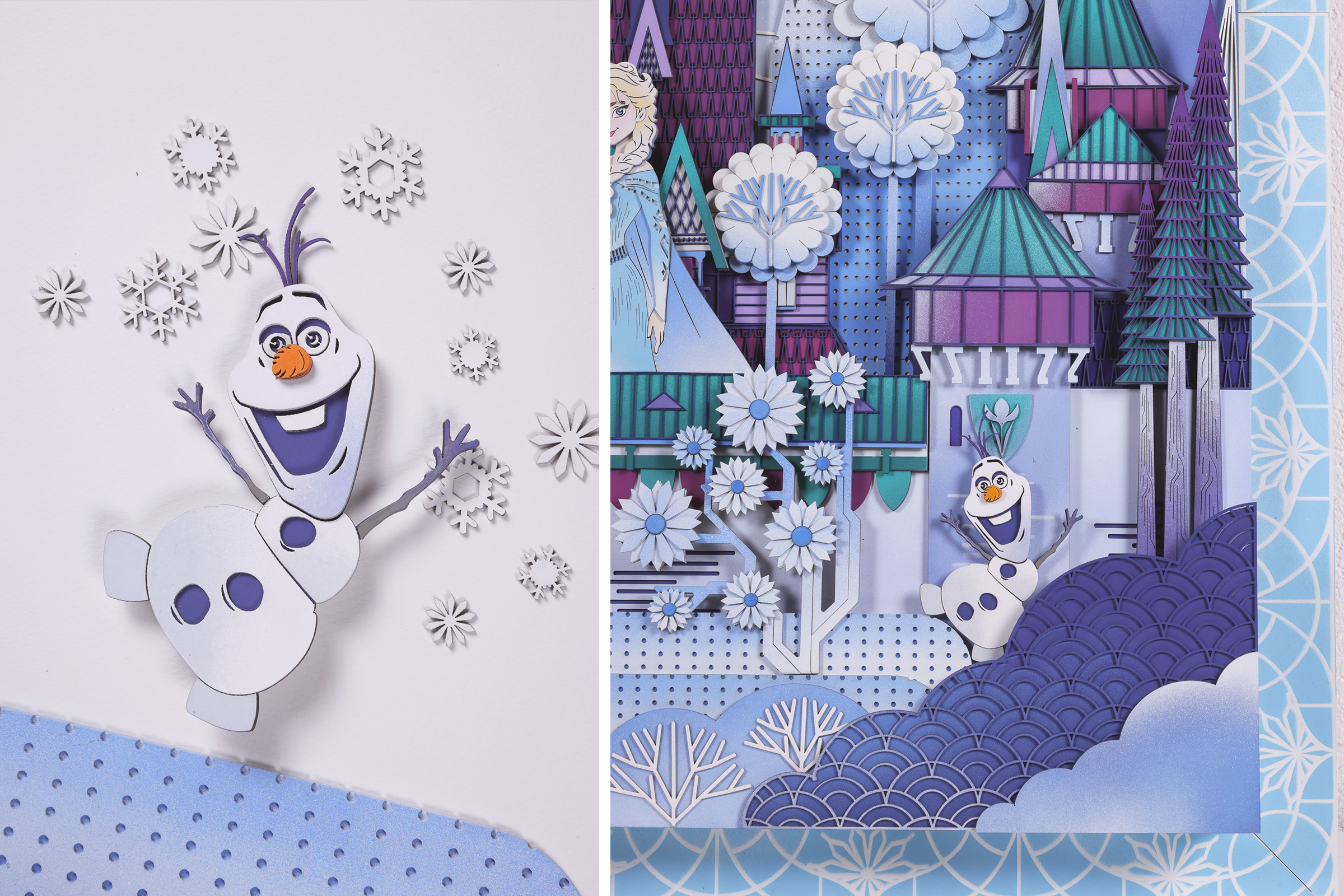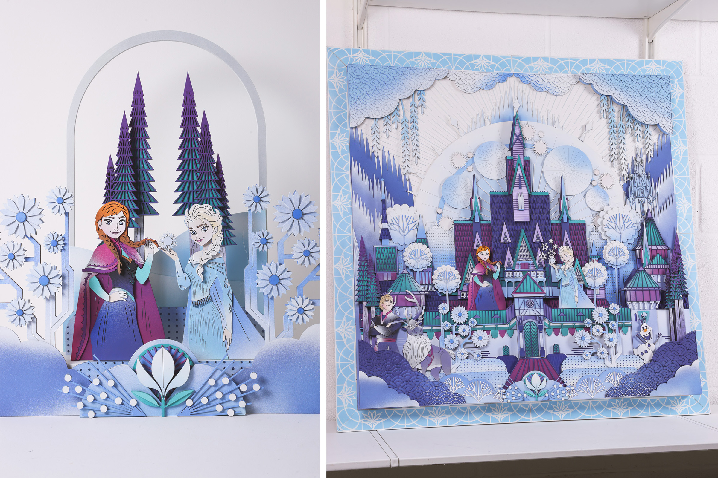 Architectures of Enchantment. Inspired by Frozen, this frame translates the story of two sisters bound by love yet separated by fate into a winter architectural tableau. At its center stands a welcoming palace that anchors the composition, rising powerfully within a landscape of pine forests, snow-covered hills, and delicate ornaments that shimmer with quiet magic. 105 x 105 x 10 cm